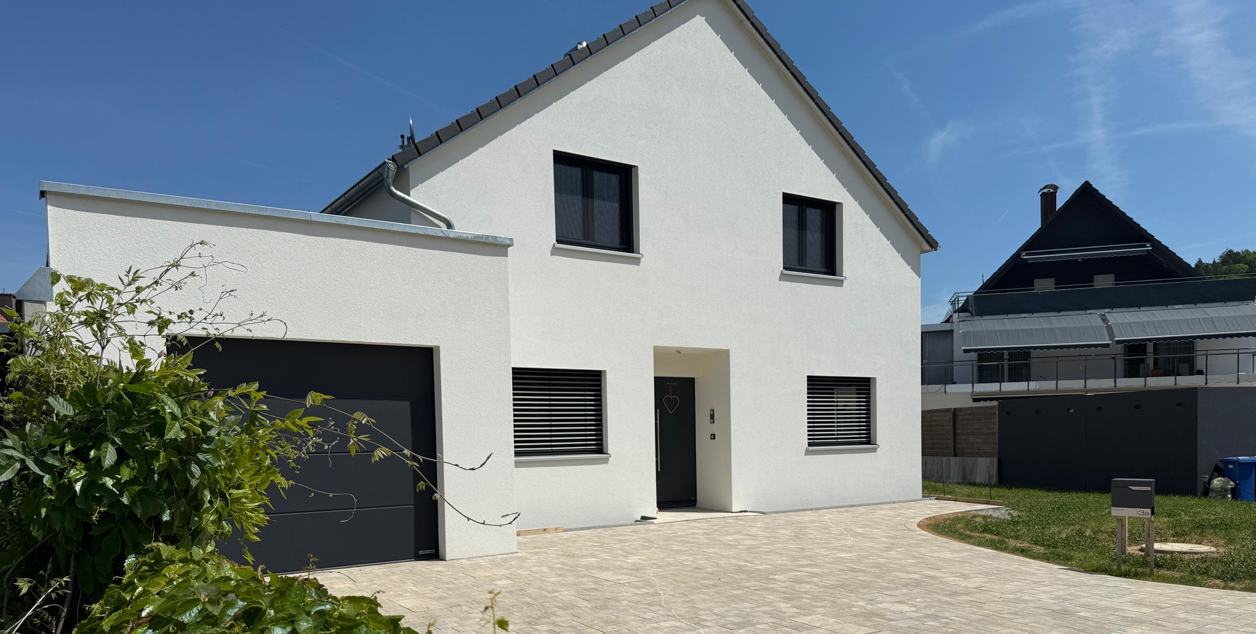 In Grünsfeld durfte ein modernes Einfamilienhaus in Holzständerbauweise entstehen. Die Bodenplatte wurde Anfang 2023 erstellt, anschließend wurde der Rohbau mit vorgefertigten Elementen und einer BSH-Decke innerhalb einer Woche errichtet.