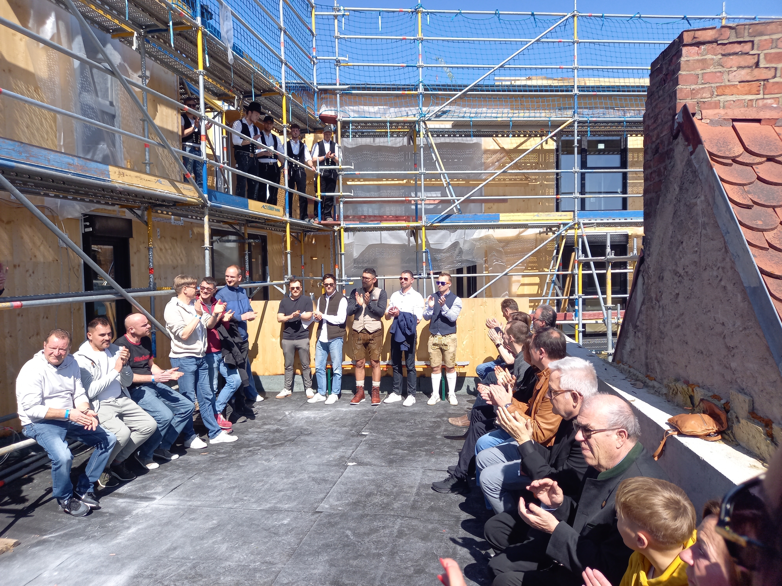 Am 04.04.2025 durften wir gemeinsam einen weiteren Meilenstein eines besonderen Bauprojektes feiern – das Richtfest in der Wirsbergstraße. Diese Baustelle war für alle Beteiligten nicht gewöhnlich. In bester innerstädtischer Lage wurde das bisher einzige Projekt in Würzburg mit Anwendung der neuen Holzbaurichtlinie in Gebäudeklasse 5 umgesetzt. Das Vorhaben wurde bereits 2019 der KOSA (Kommission für Stadtbild und Architektur) präsentiert und jetzt umgesetzt. Nun war Zeit zum Feiern.